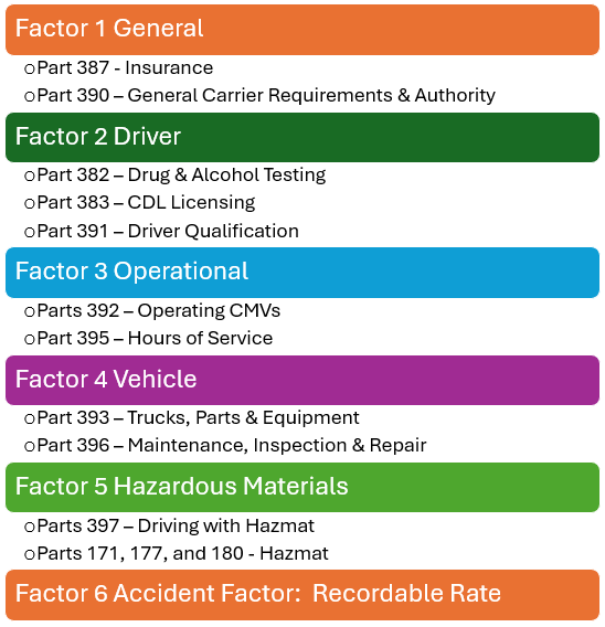 Hazardous Materials: For carriers that transport hazardous materials, this factor assesses compliance with regulations governing the handling, labeling, and transportation of hazardous materials, including emergency preparedness and spill response procedures.