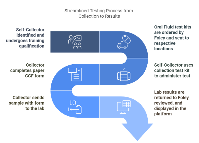 - Oral Fluid test kits are ordered by Foley and sent to respective locations.