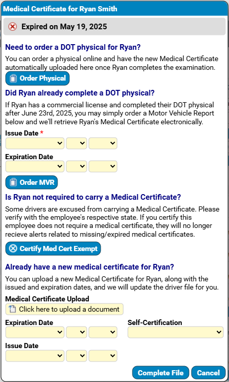 Instead, within the alert itself users will be able to provide the Issue Date for their driver’s latest medical certificate and click Order MVR, and we’ll electronically retrieve their Medical Certificate from the state licensing and update their Compliance File automatically: