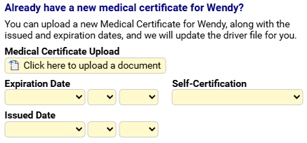 A: Like the platform alert, the associated self-service option—which drivers will see if your organization chooses to have them provide their Medical Certificate details—allows for electronic retrieval of a commercially licensed driver’s Medical Certificate by ordering an MVR. If the driver enters an issue date of June 23, 2025, or later, they won’t need to upload a document.