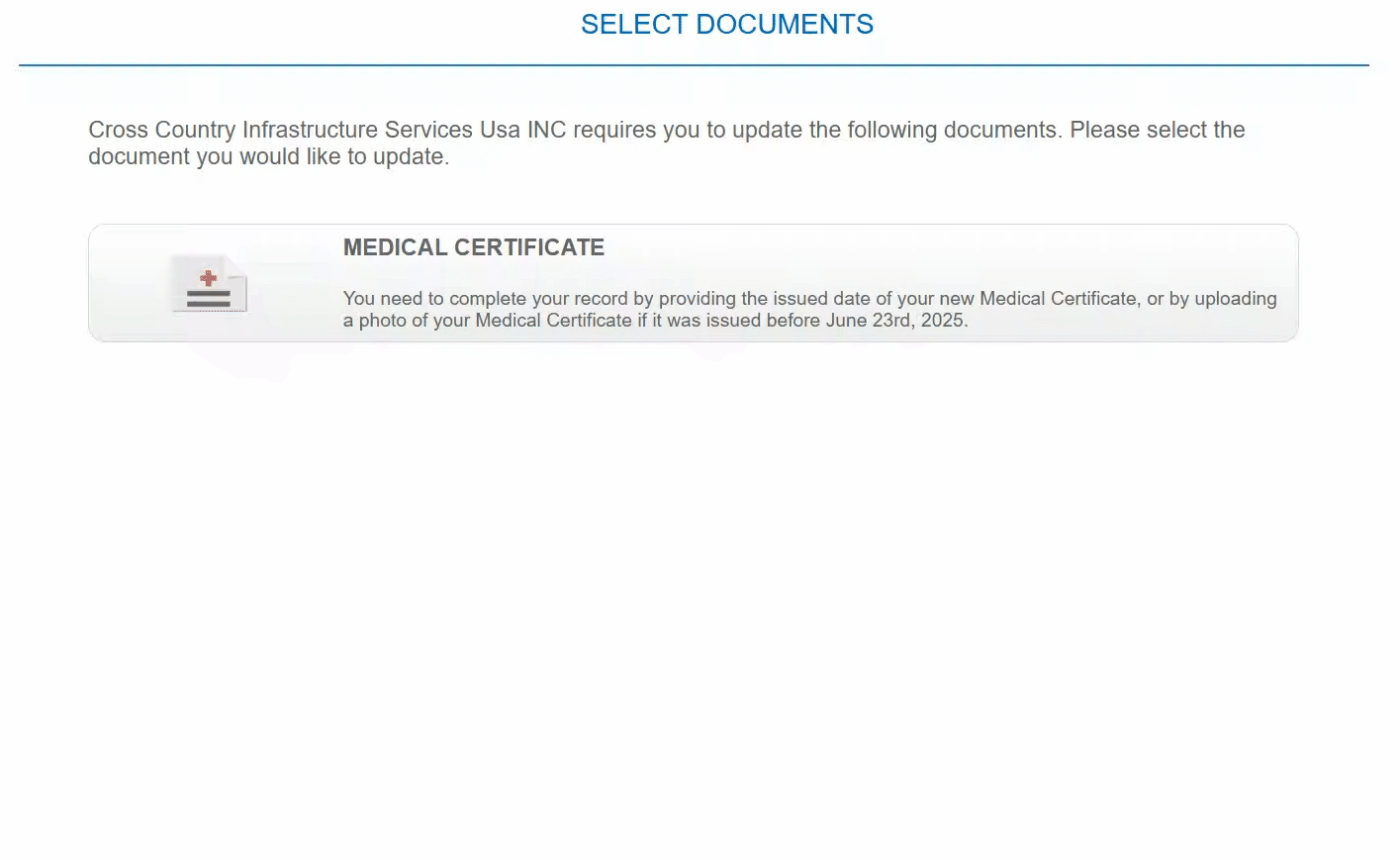 However, during the transition period and over the next ~2 years, there will still be commercially licensed drivers who hold physical copies of their Medical Certificate, and therefore, the alert will still display the upload option until the transition period is over: